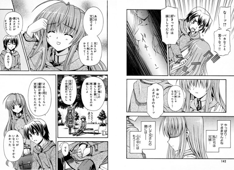 妹が兄を異性として好きと明かすのは親しい相手でも勇気がいるのに出会って間もない優姫にあっさり暴露したのは惚れた相手が同じかつ、準一と優姫の仲が深まって本当に結ばれる焦燥感が兄妹の関係に甘んじてた湊に一線を越える踏ん切りをつかせてしまったのか・・・。