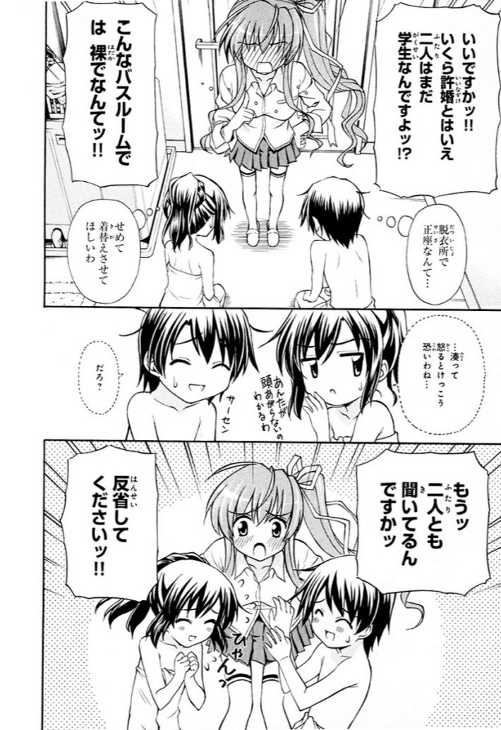 そういうワケで優姫は負けじと風呂🛀で準一の背中を流すのだが、湊へバッタリ鉢合わせしてしまい、脱衣所で説教をする。結婚💒したら[NARUTO]の[ヒナタ]みたいにしっかりしなきゃと責任感を持ってキツめな性格に変貌してそうだよな。